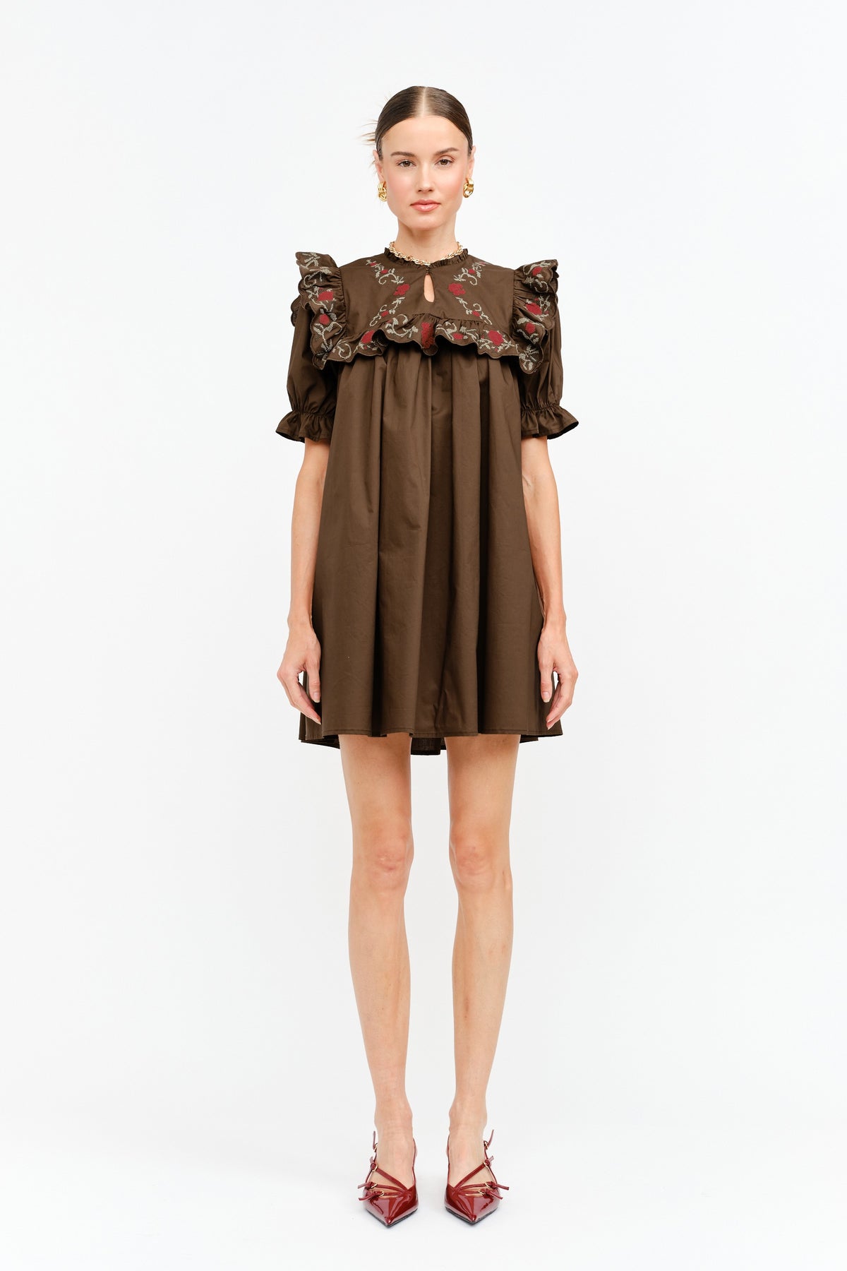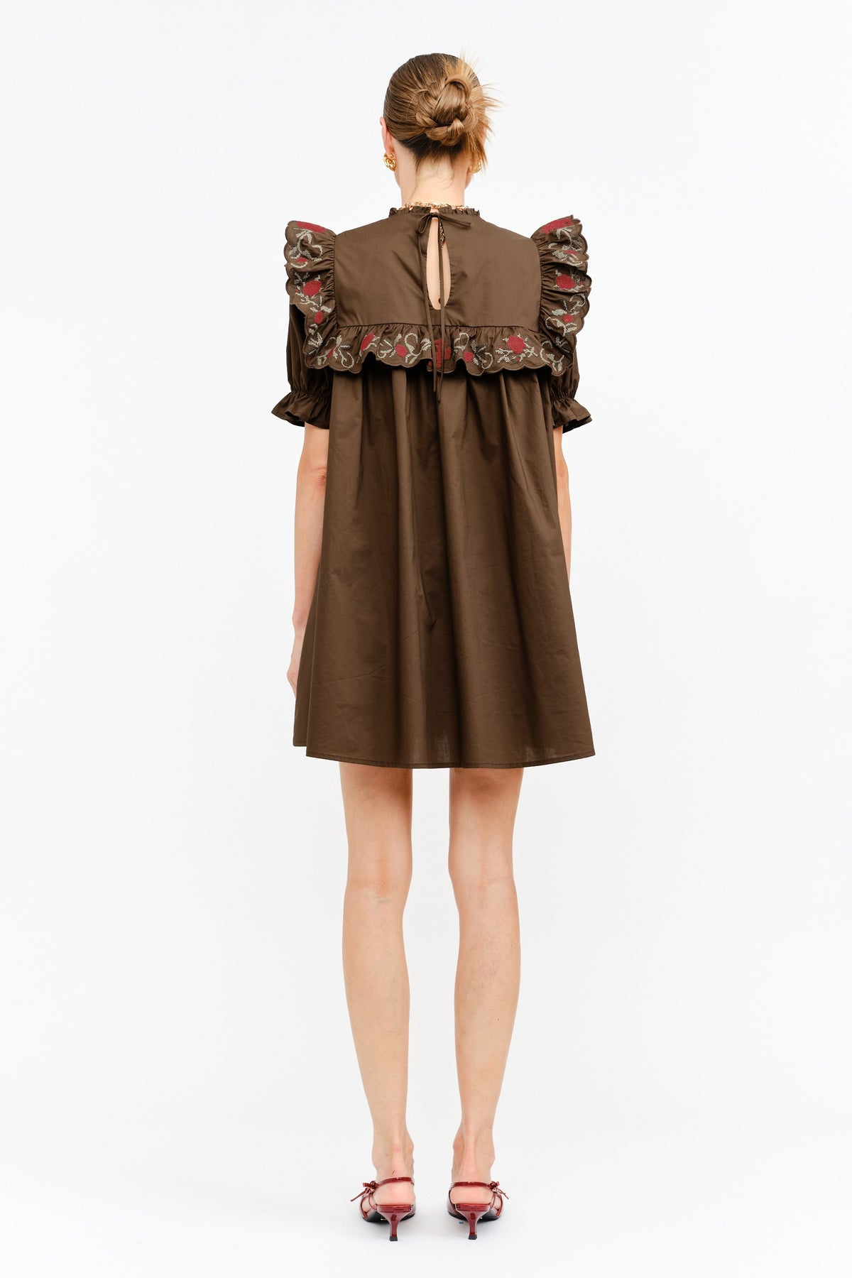 COTTON-POPLIN MINI EMBROIDERED BABYDOLL DRESS