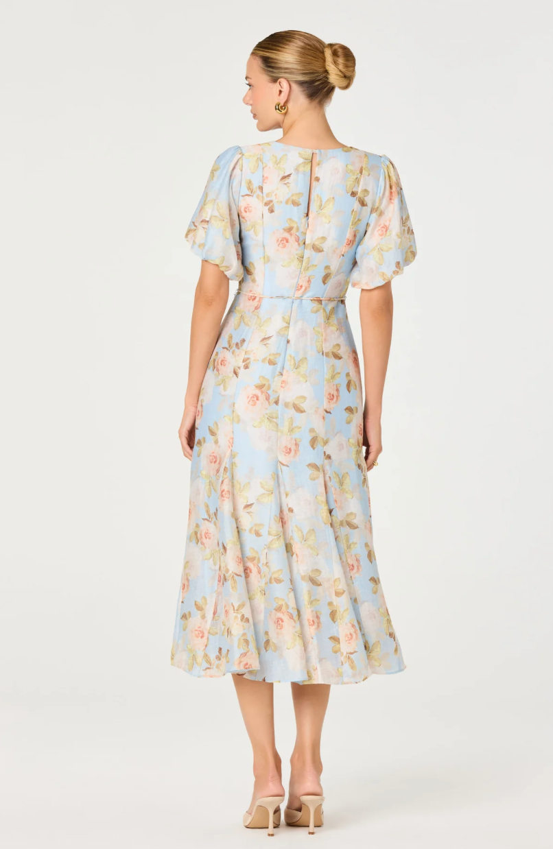 • Woven V-neck midi dress in floral print, balloon sleeves with elastic cuffs