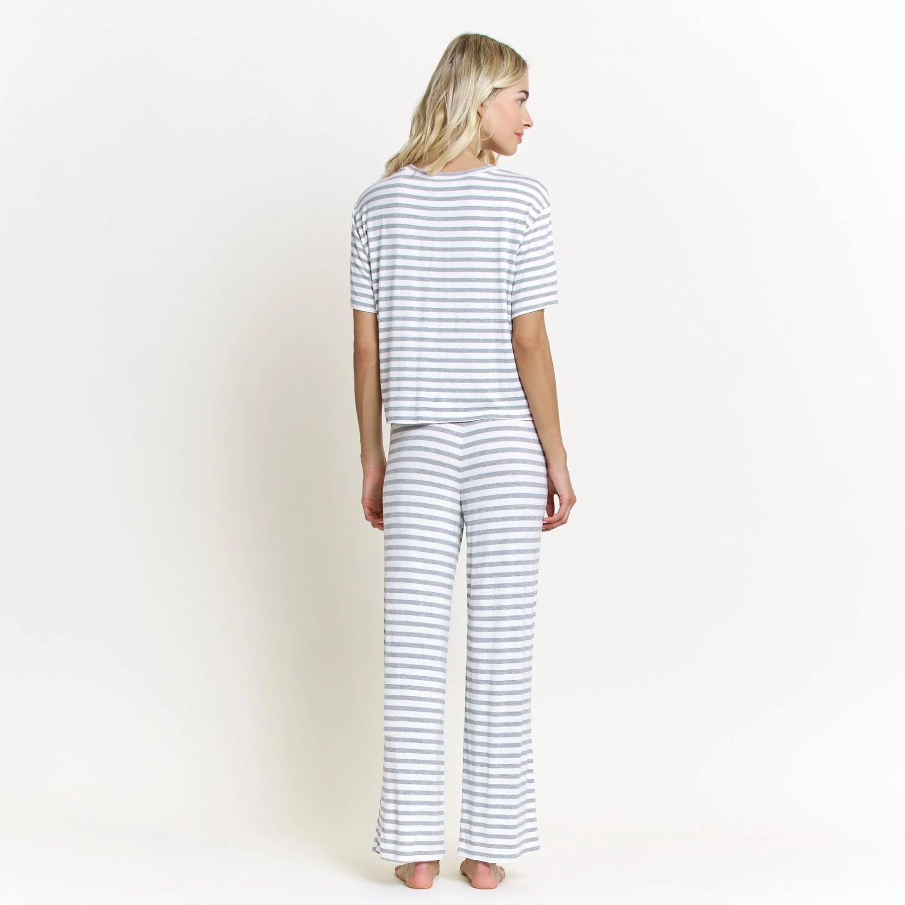 A relaxed short sleeve drop-shoulder tee paired with a wide leg drawstring pant in a soft, lightweight jersey fabric.
