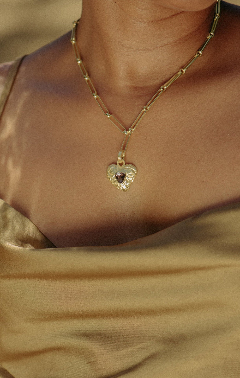 This stunning 18k brushed gold-plated paper clip chain necklace is a modern and playful piece. It features a hammered heart pendant with an organic shaped stone at its center, adding an elegant touch of shine. The chain measures 17 inches with a 2-inch extender, offering a customizable fit, while the pendant itself measures 1 inch for a subtle yet striking focal point. This necklace pairs beautifully with the Lutea Earrings.