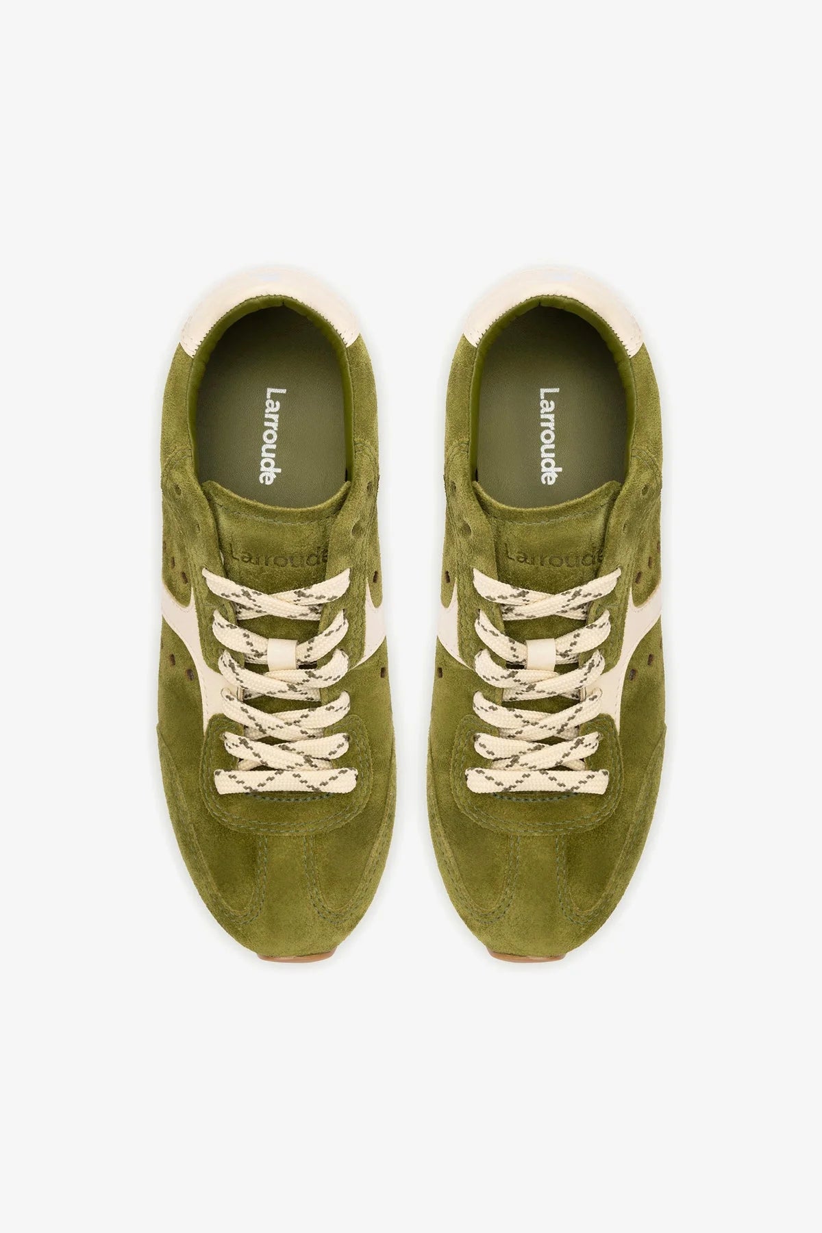 We're in our athletic era. Introducing the very first sneaker by Larroudé, the Stella blends functionality and form with fashion, in a rich green suede that you can wear with anything from day dresses and denim to workout gear at