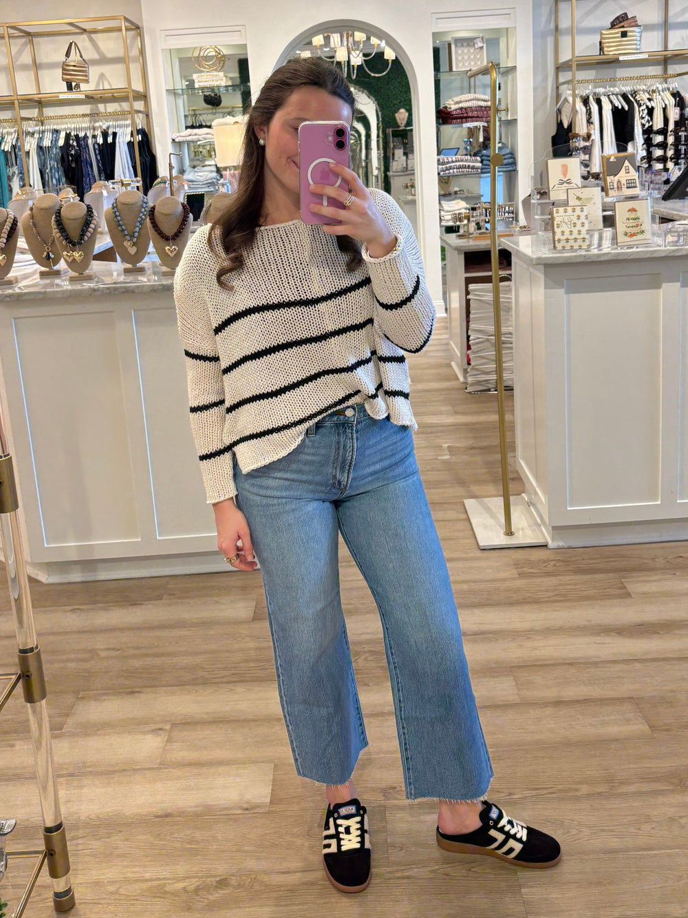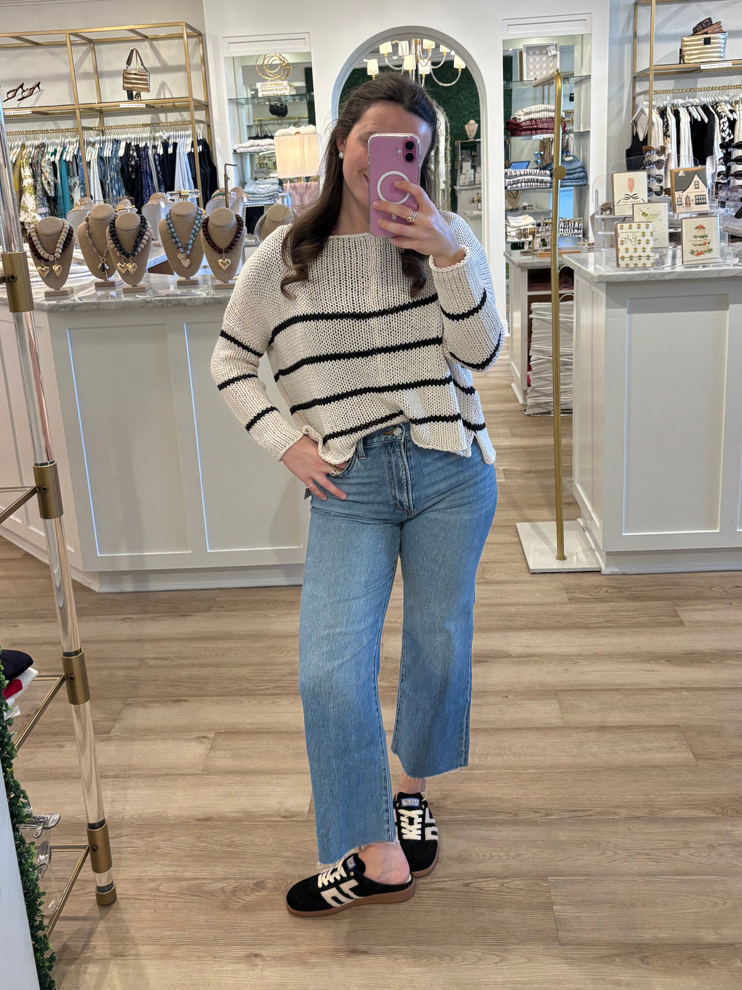 Key West Striped Chunky Crew Cotton Almond Butter/Black