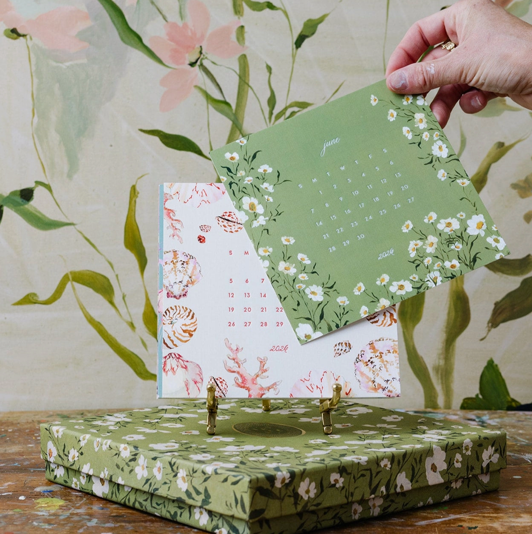 2026 Calendars are in stock and ready to ship! Twelve watercolor designs and letter-pressed numerals on 6" square cards. Nestled in a collectible linen box. Please note, this calendar is not sold with a display option. If you'd like either a clear acrylic base or a brass easel, be sure to add one to your order.