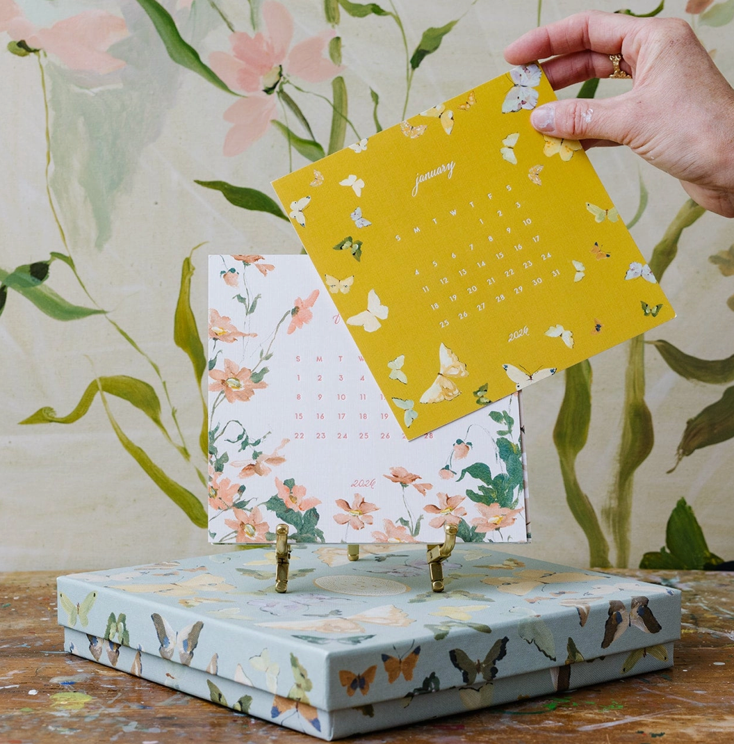 2026 Calendars are in stock and ready to ship! Twelve watercolor designs and letter-pressed numerals on 6" square cards. Nestled in a collectible linen box. Please note, this calendar is not sold with a display option. If you'd like either a clear acrylic base or a brass easel, be sure to add one to your order.