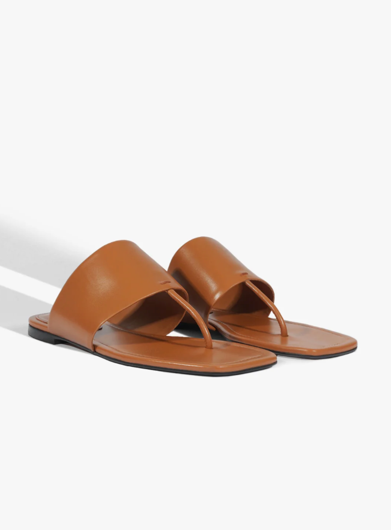Effortless and bold, the flat Martha sandal is crafted from quality brown leather, features a thong entry and a strong upper strap that brings contemporary edge to the mule silhouette. The flat sole ensures comfort and easy movement throughout your day. Its slip-on style makes it a go-to for casual outings or laid-back weekends. Mix and match it with jeans, dresses, or shorts for endless styling options.